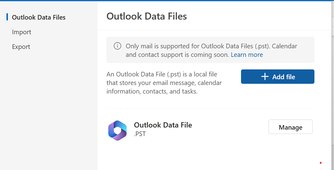 Currently, New Outlook's functionality to import data from another account is limited and differs from Legacy Outlook. There are a few options available to upload a PST file into your inbox.