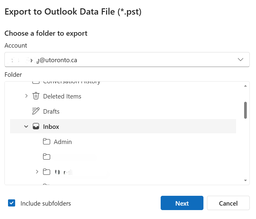 9. Pick the email folder you would like to back up. Tip: You can also scroll down to view all emails associated with your account if you wish to export files from a secondary email. Then click Next.