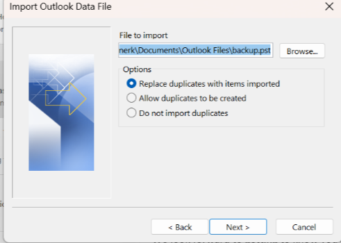 Browse to the location of your PST file, select it, and choose how you want to handle duplicates.