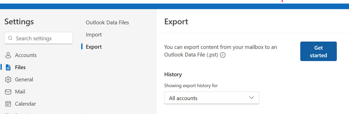 Select Get Started. Choose the folder you wish to export. You'll also need to identify the folder where the data will be imported.