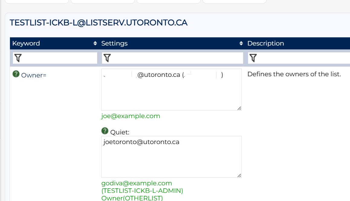 - Delete the previous owner and type the new primary owner’s address and name in the Owner section, or delete the secondary/quiet owner and type the new secondary owner’s address and name in the Quiet section. ("Quiet" owners have list administration privileges but do not receive administrative messages.)