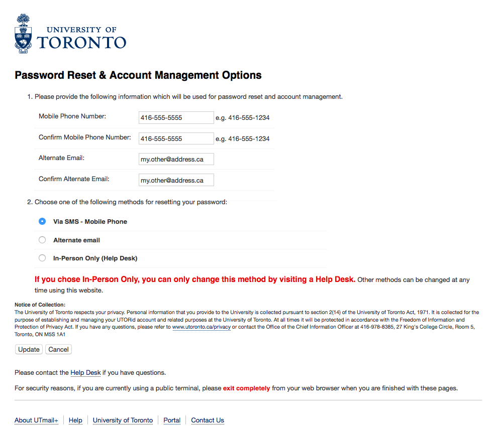 - Go to the UTORid Management page and select set up your password reset / account management options under Password and Account Management.