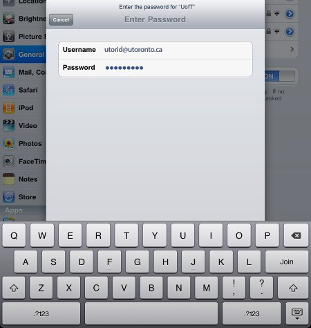 - You will be prompted for your username and password. Type UTORid@utoronto.ca (replacing UTORid with your actual UTORid) and password in the appropriate fields. Tap Join.