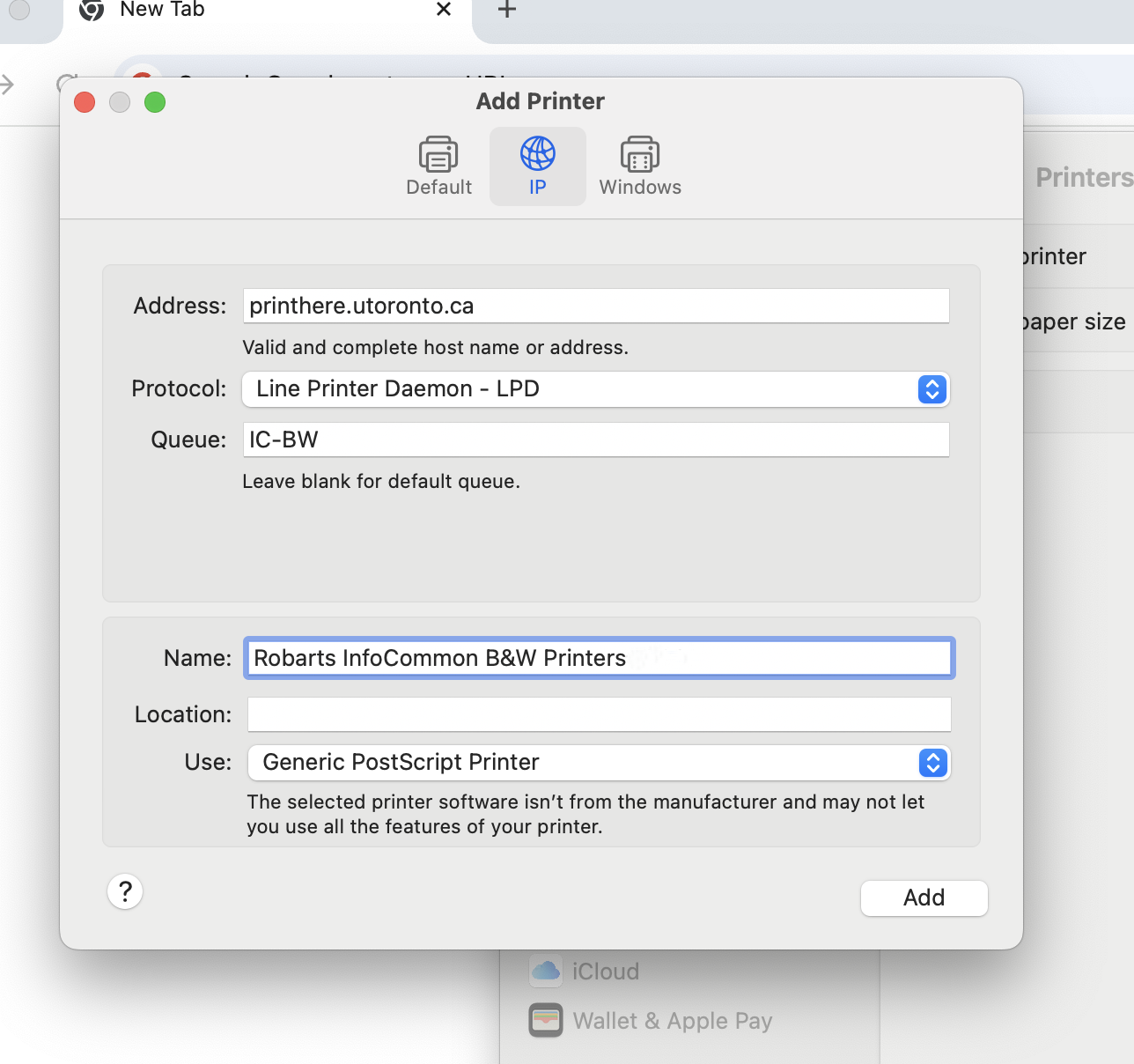 | Robarts InfoCommons B&W Printers | IC-BW | Yes | (Generic PostScript Printer) | |