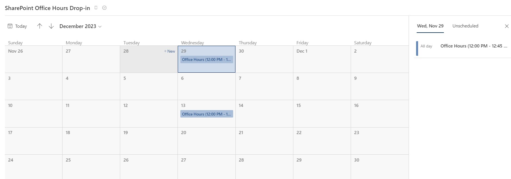 With the Events web part, you can embed the app into a SharePoint page to show upcoming events. Events can be downloaded and added to your Outlook calendar.