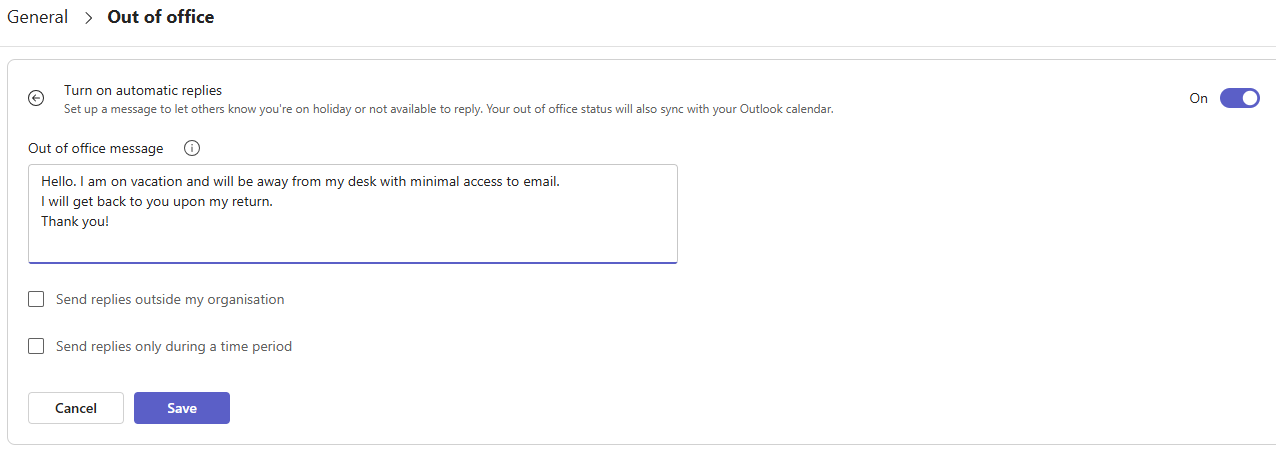 NOTE: If you choose to update your out of office details in Outlook, your changes will be reflected in Teams.