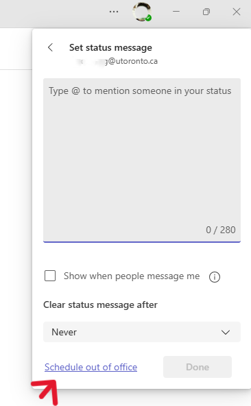 There are two ways to schedule your out of office status and message in Teams.