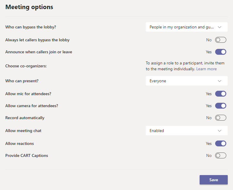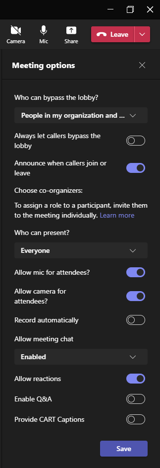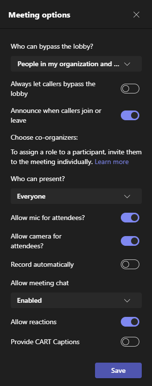 Teams makes it easy for meeting and webinar organizers to customize their event settings. These settings can determine how event attendees are able to engage with content throughout the meeting or webinar.