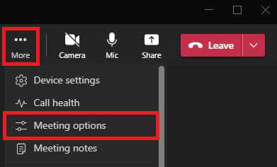 1. In the Teams meeting toolbar, click on More actions (three dots icon). In the drop-down, select Meeting options to open the Meeting options side panel.