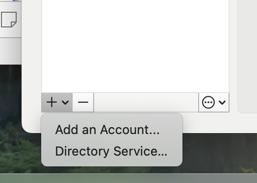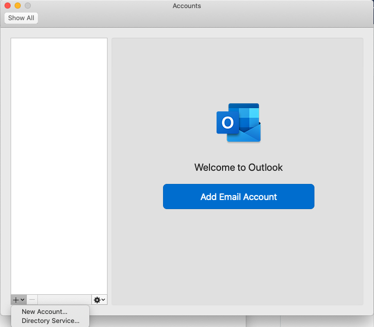 2. In the window that opens, click Add Email Account. If you already have an account in Outlook, click on the plus sign in the bottom left and choose Add An Account.
