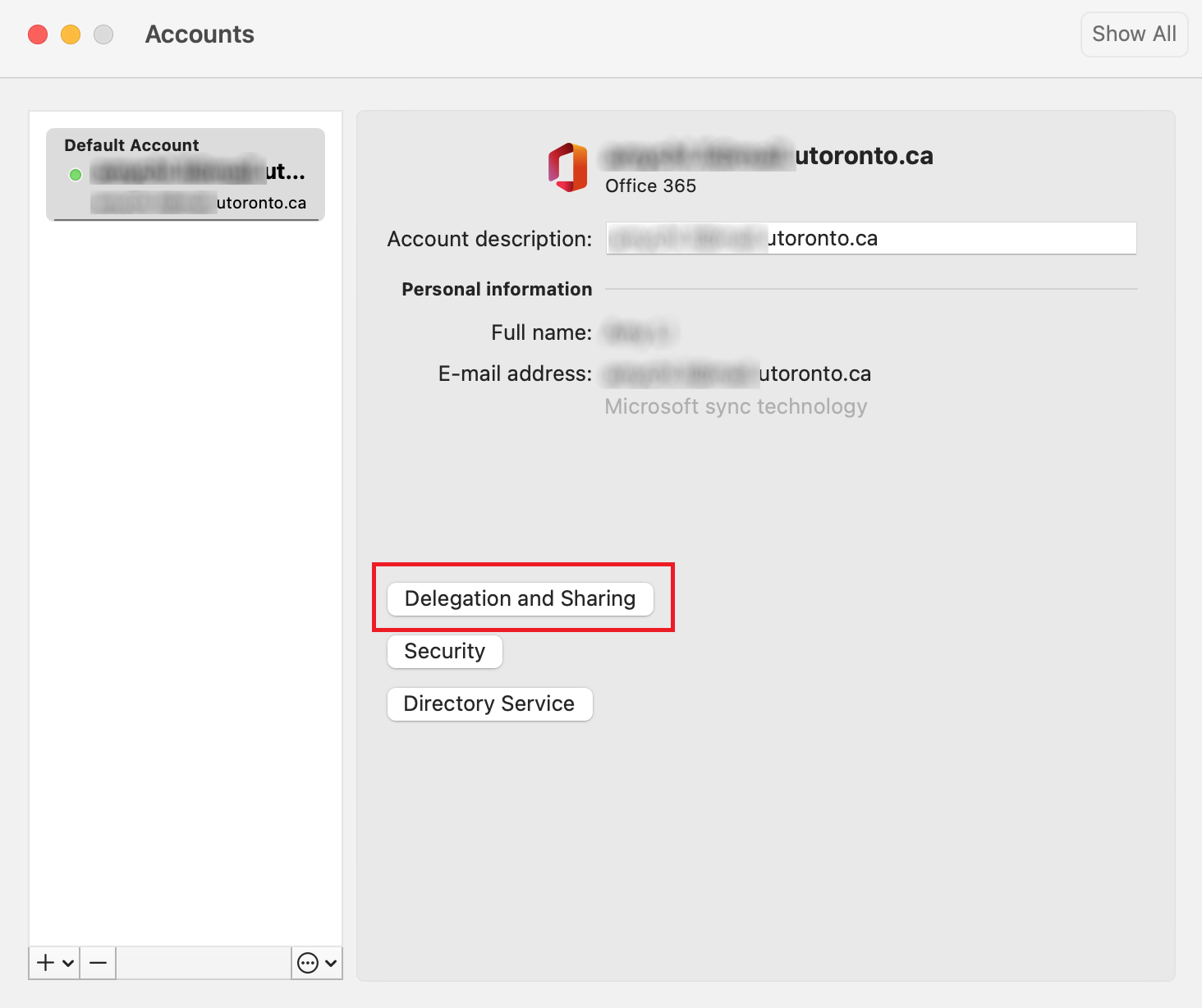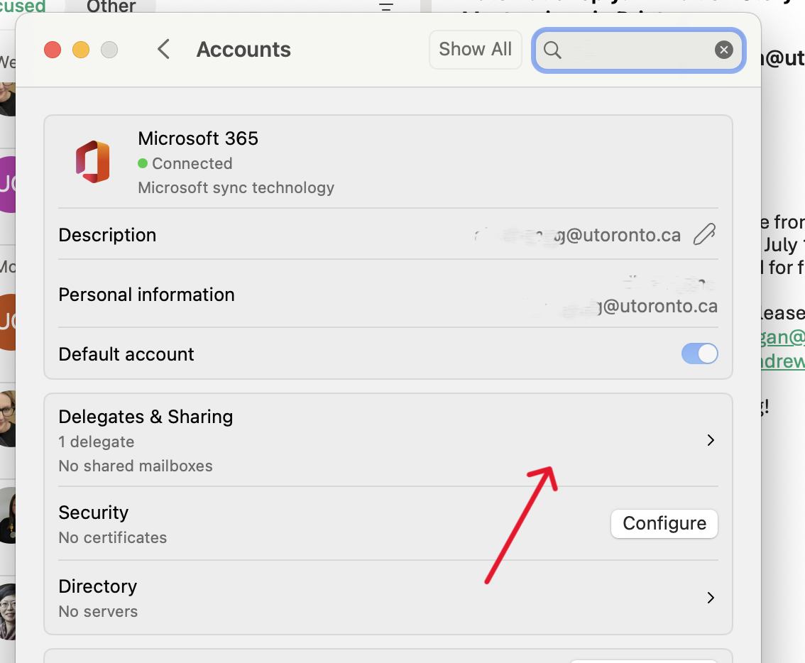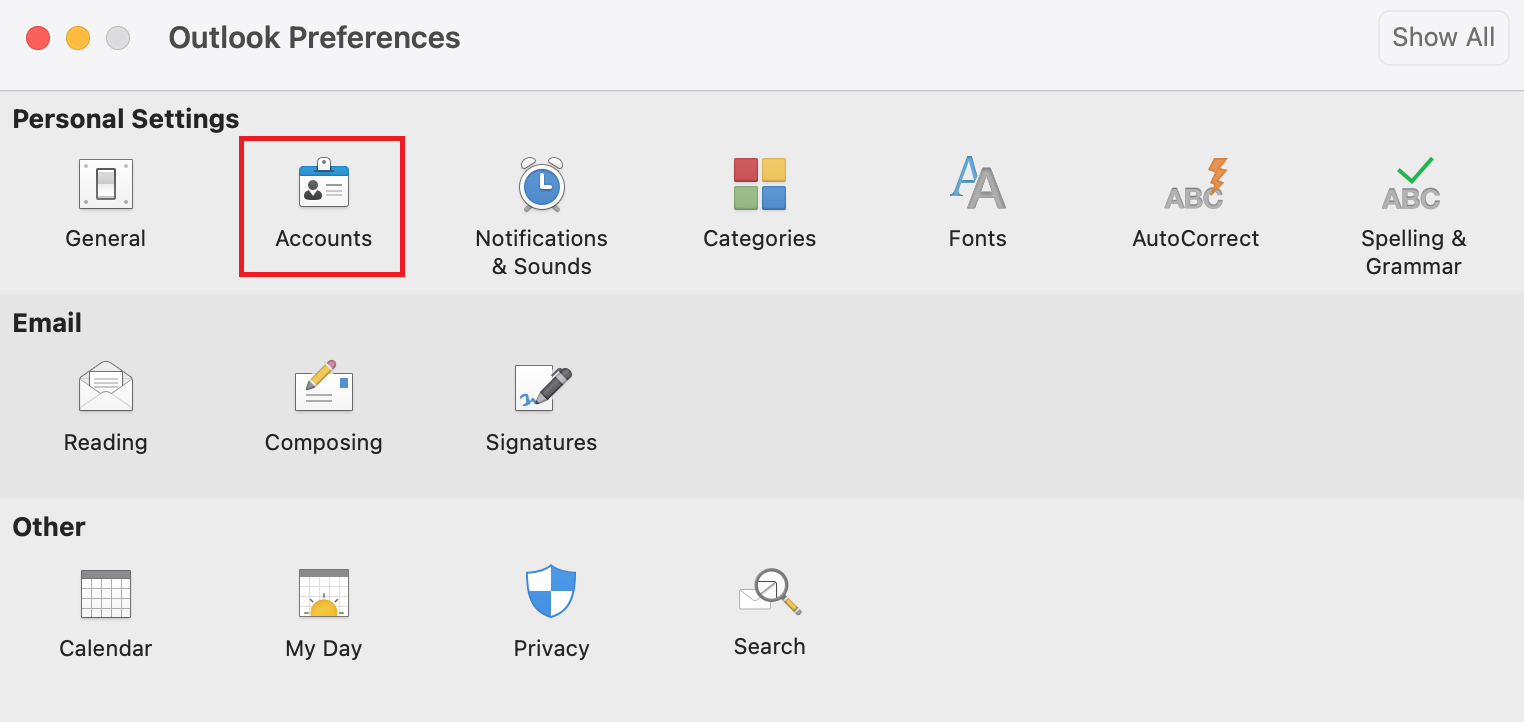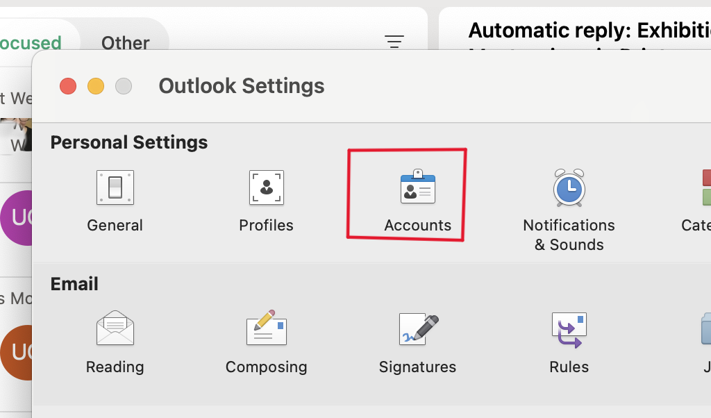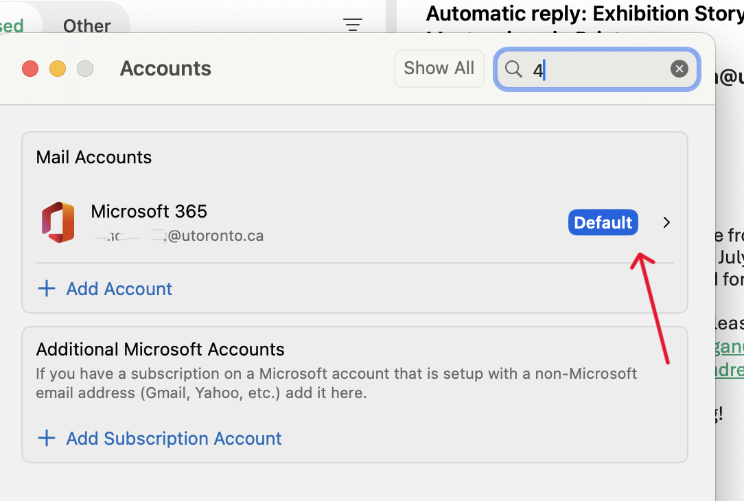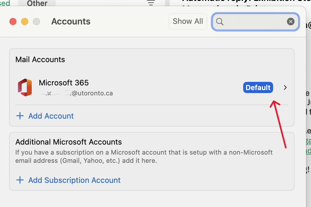 3. In the Accounts window, click on Mail Accounts. You will see your default account under the Microsoft 365 header and logo. Click on this.