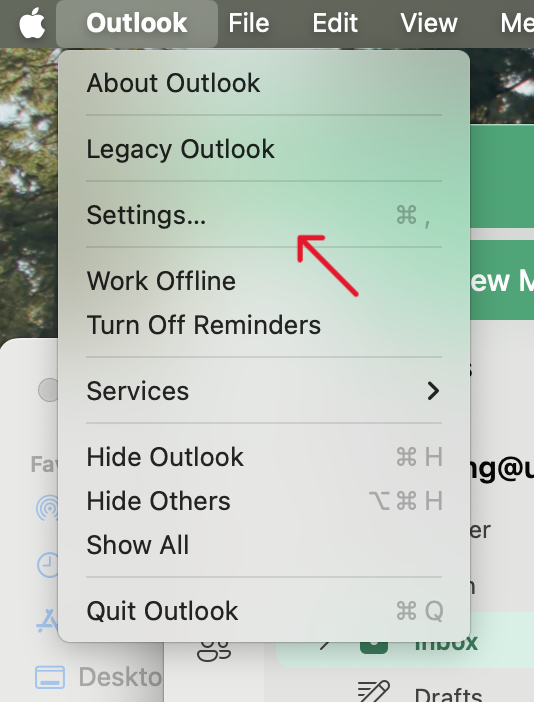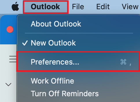 1. Click on the Outlook menu at the top, and in the dropdown, click on Preferences.
