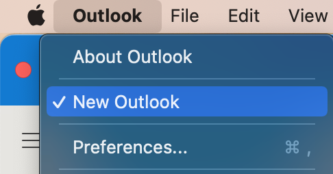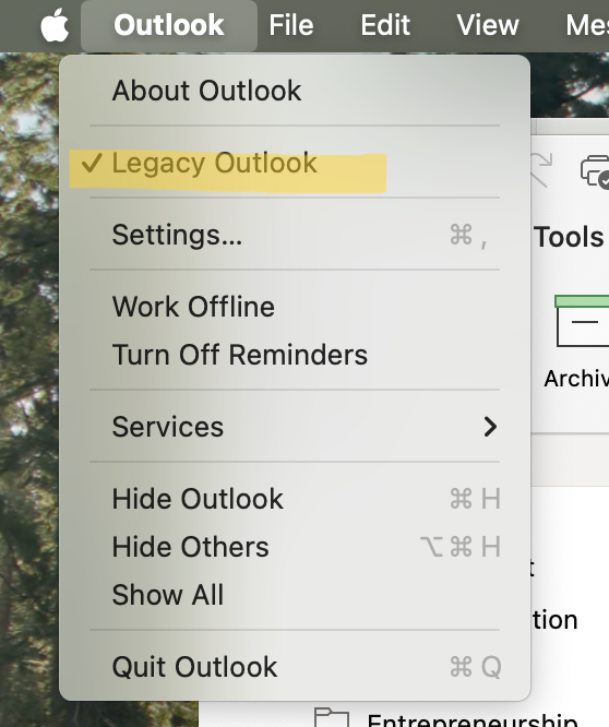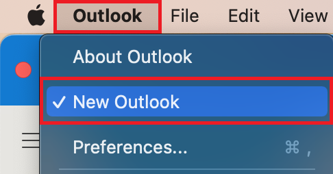 The way you open your shared mailbox depends on the version of Outlook for Mac you have. You can go to the Outlook menu to check if you are on the earlier or new version of Outlook. Check the dropdown and see if there is a checkmark beside "Legacy Outlook." If there is a checkmark, you are using Classic (Legacy) Outlook; if there is no checkmark, you are using New Outlook.