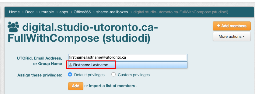 - Type the email address or UTORid of the person you would like to add. Choose their name from the dropdown.