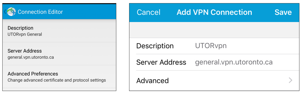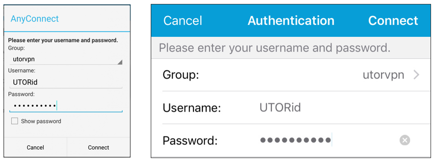 (The UTORvpn authentication interface: left, on Android; right, on iOS)