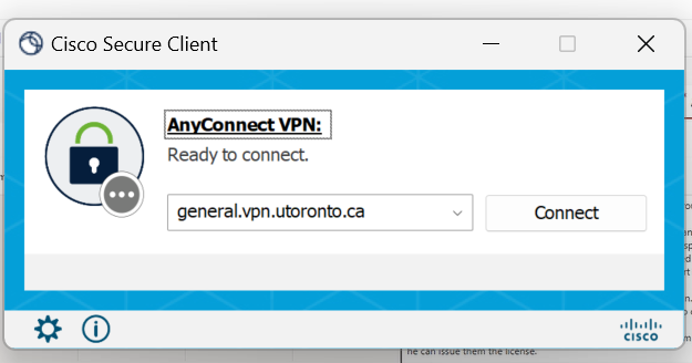 To install Cisco Secure Client for Windows, Mac, and Linux machines, click to download the appropriate client from U of T's Secure Client download site (login with your UTORid and password). Open or run the downloaded file to install it.